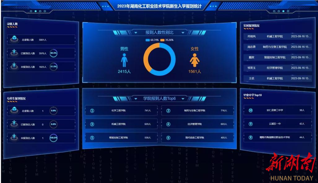 在该校学生工作部会议室内,屏幕数据实时更新。通过信息采集和大数据分析,各二级学院分时段报到进度一目了然。该校对报到流程进行升级再造,新生来校前可通过“湘化e云”APP进行线上个人信息完善、军训服尺码预定、宿舍安排、学费缴纳等全套流程办理。