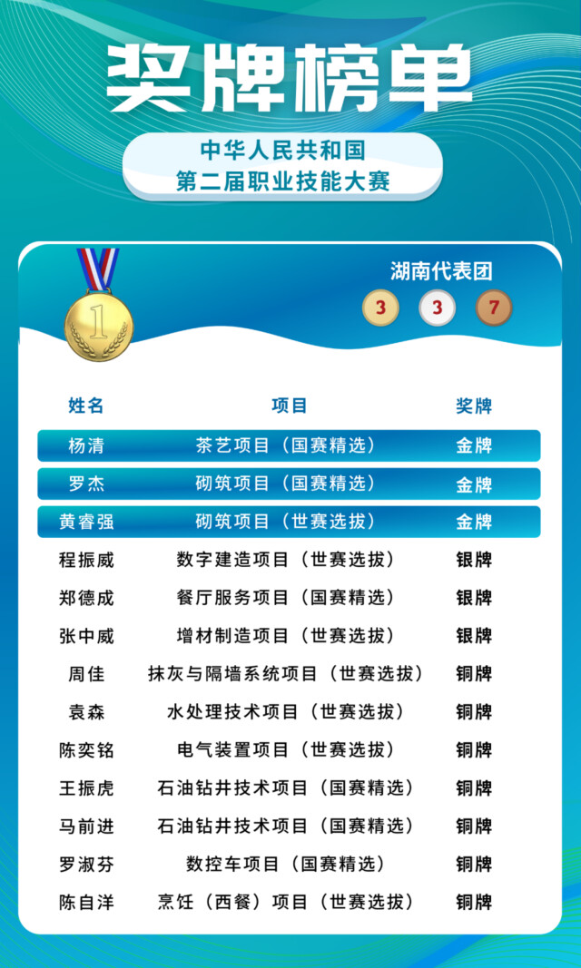 与首届全国技能大赛取得1金1银2铜46优胜奖相比,湖南在本次大赛中的成绩实现质、量“双提升”。从竞争强度看,本次大赛共有来自全国各地的4045名选手角逐109个项目奖牌,较上届2500余名选手争夺86个项目奖牌,竞争更为激烈。从奖牌数量看,金、银、铜牌数量均增加2倍以上,优胜奖数量增幅超过50%。从获奖领域看,我省在建筑业和服务业项目保持优势的同时,在工程机械、轨道交通、电子信息等行业领域有长足的进步,在新业态领域的表现也十分突出。