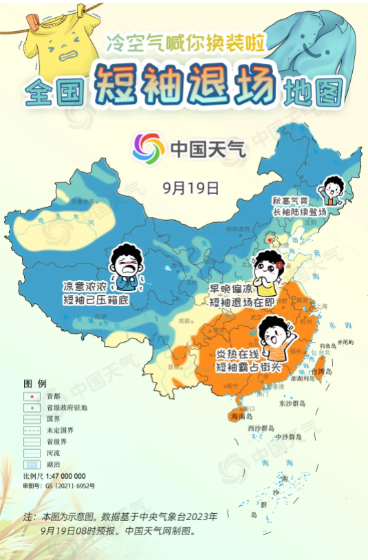 进入9月中旬,冷空气变“劳模”频繁来袭,西北、东北大部都已迈入秋天门槛,但华北一带今年秋天似乎来得有点儿晚,南方地区白天甚至热到还要开空调,不少网友喊话:“秋高气爽何时能来?”9月19日至21日,受冷空气和降雨共同影响,长江以北大部地区将陆续迎来降温,开启秋日初体验。中国天气网特别推出全国短袖退场地图,看看哪里可以安排秋天的第一件长袖。