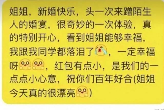 回到学校后,小西将事情记录下来,发到社交平台上。面对部分网友认为两人“随的份子钱太少”的质疑,她表示,因为两人是学生,确实拿不出特别多钱,但又不好意思不给,才会选择随100元。