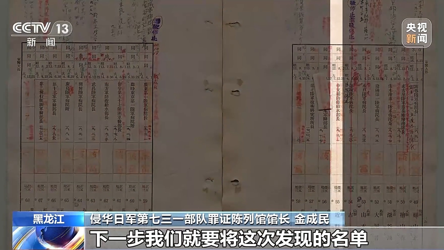 侵华日军第七三一部队罪证陈列馆馆长 金成民:所有的细菌部队的军官名单在这里面完整地能揭示出来,看出来整个细菌专业特种部队的庞大规模,下一步我们就要将这次发现的名单和过去已经发现的七三一部队等相关细菌部队的职员表,加上《留守名簿》进行梳理、比对和研究,最终能够得出各个细菌部队的具体人数和人员的流转这样一个全面的状况。
