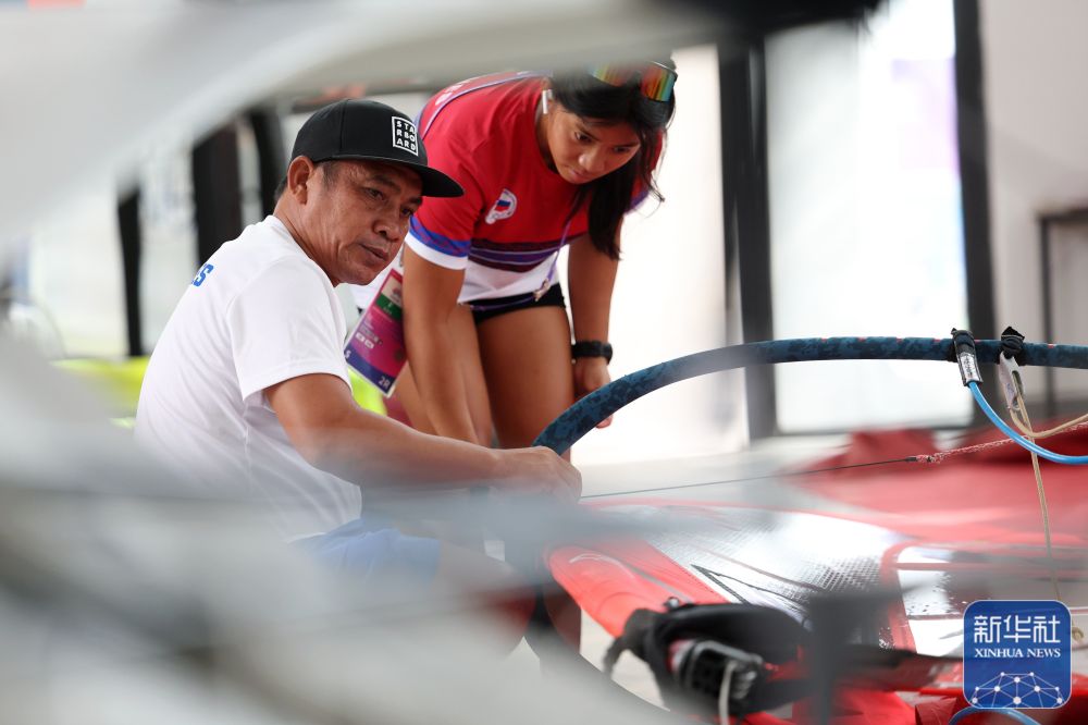 ↑9月20日,菲律宾队在检查帆板。新华社记者 陈斌 摄