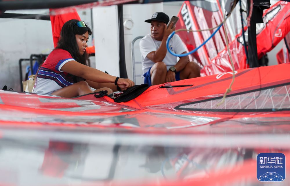 ↑9月20日,菲律宾选手在整理自己的帆板。新华社记者 陈斌 摄