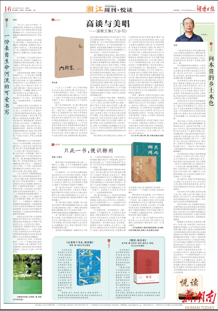 第一篇“客从何处来”。文章对千载人文的探索上溯至炎帝神农,下追至宋元明清,既追寻郴州历史来源,也在诗山文海中游历郴州之美。字里行间情深意切,合上书页,口中仍会不经意地吟诵:“衡阳犹有雁传书,郴阳和雁无。”
