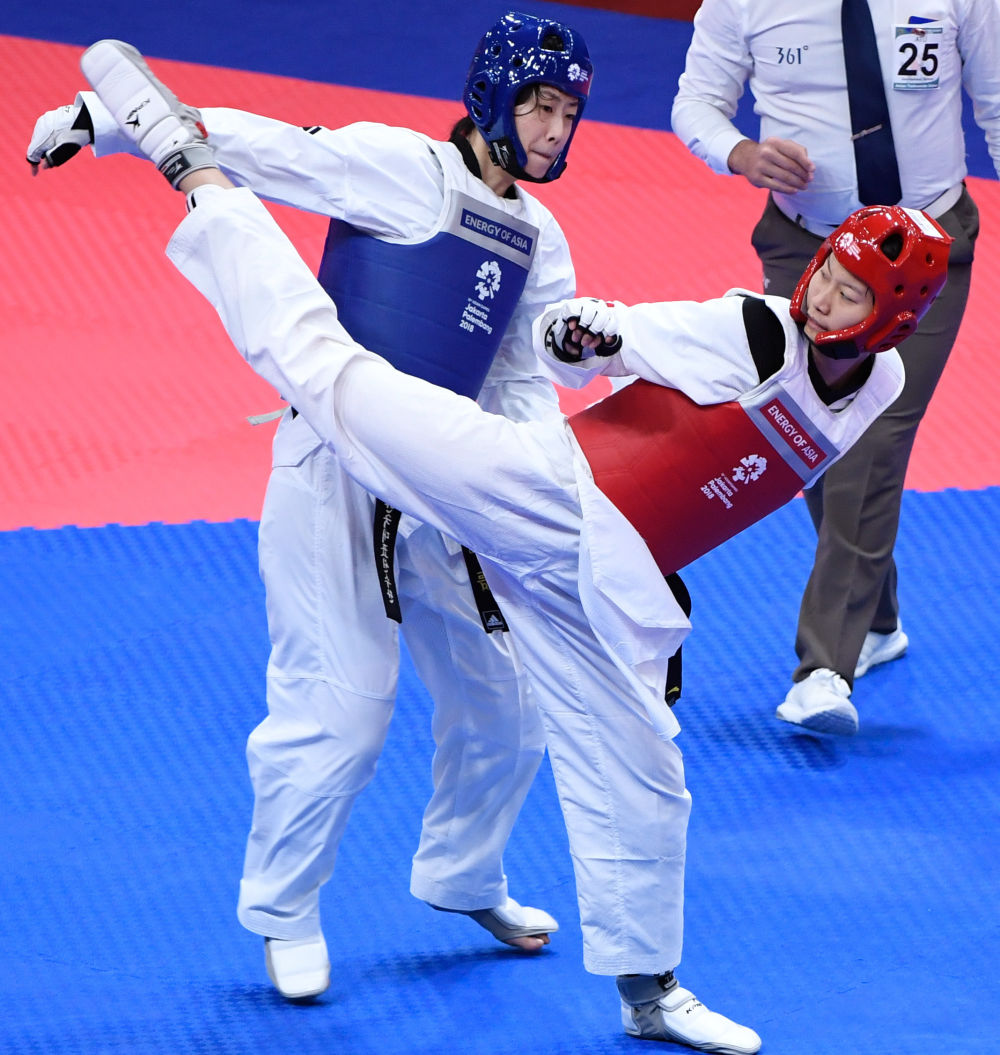2018年8月21日,骆宗诗(右)在第18届亚运会跆拳道女子57公斤级比赛中。新华社记者 黄宗治 摄