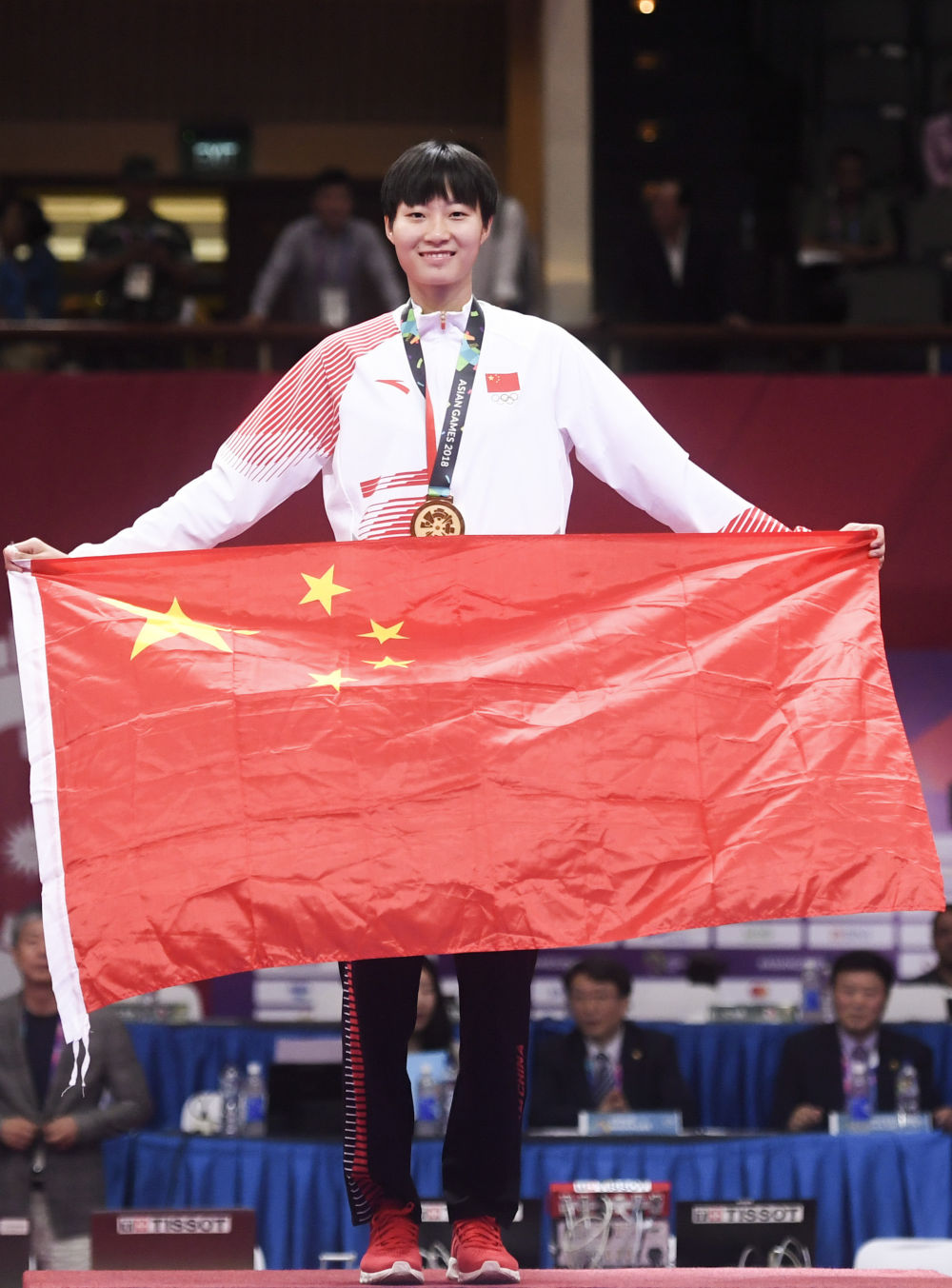 2018年8月21日,中国选手骆宗诗在颁奖仪式上。当日,在雅加达举行的第18届亚运会跆拳道女子57公斤级比赛中,骆宗诗战胜韩国选手李雅琳,获得金牌。新华社记者 黄宗治 摄