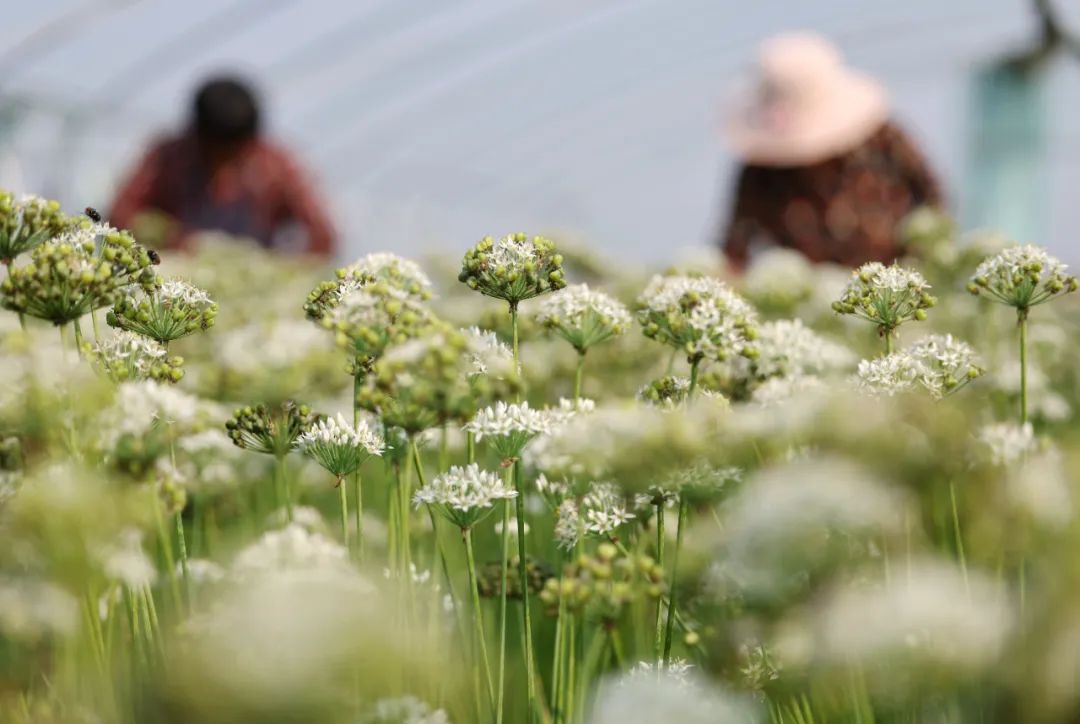 9月17日,在山东省临沂市沂南县苏村镇,农民在采摘韭菜花。新华社发(王彦冰摄)