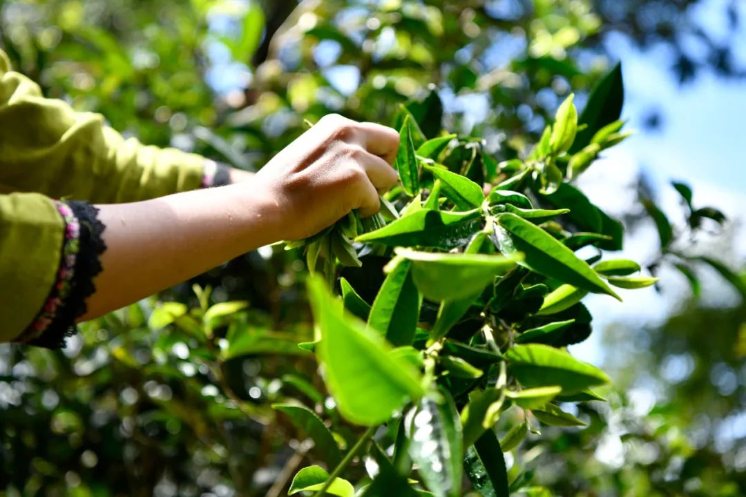 9月19日,景迈山翁基古寨的布朗族茶农玉勐在古茶林里采摘秋茶。新华社记者 唐如峰 摄