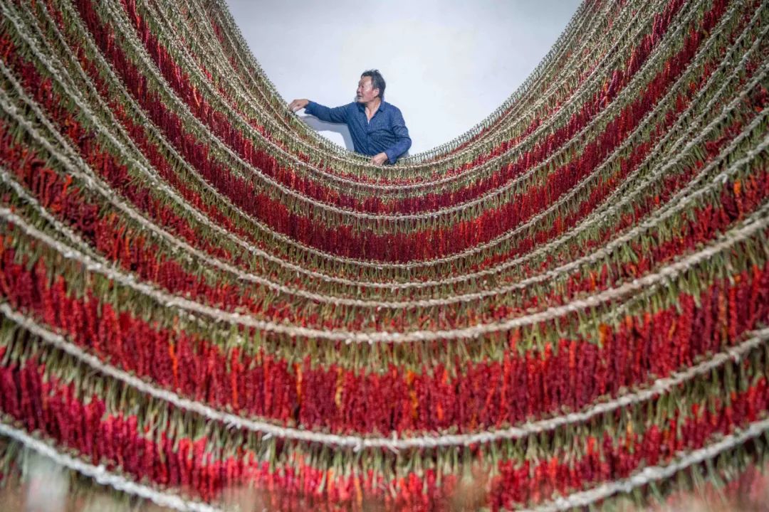 9月13日,村民在贵州省毕节市大方县理化乡金鸡村查看辣椒烘干情况。新华社发(罗大富 摄)