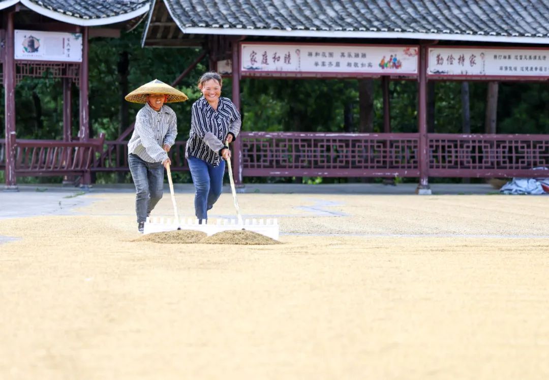 9月17日,贵州省铜仁市玉屏侗族自治县亚鱼乡郭家湾村村民在晾晒稻谷。新华社发(胡攀学摄)
