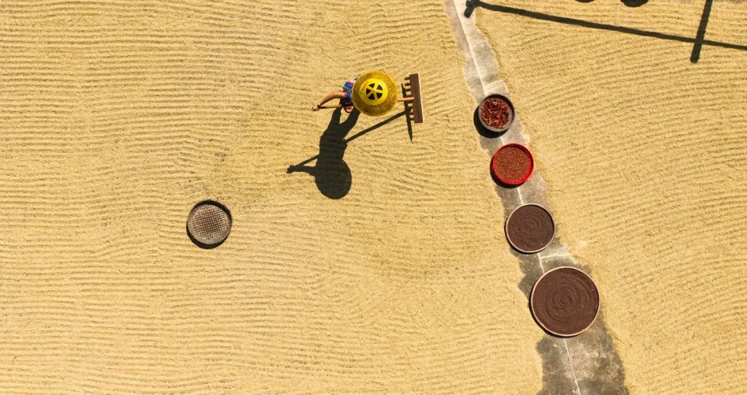 9月17日,湖南常宁市洋泉镇村民在晾晒谷子(无人机照片) 。新华社发(郭宜庚 摄)