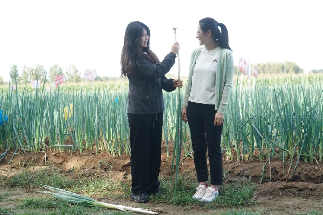 9月20日,在北京市平谷区东高村镇赵家务村大葱种植基地,市民与大葱比高度。新华社记者 任超 摄