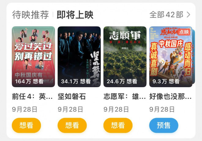 《坚如磐石》《莫斯科行动》《好像也没那么热血沸腾》《前任4:英年早婚》《志愿军:雄兵出击》在内的5部真人电影,以及6部动画电影,预计11部影片。