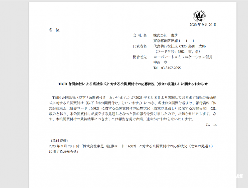 2022年9月30日,JIP向东芝公司提交了一份关于第二次招标过程的提案,声明它有意通过对东芝的股票进行收购要约的方式对东芝进行私有化交易。在提交该提案时,拟定的收购要约价格范围为每股5200日元至5500日元。