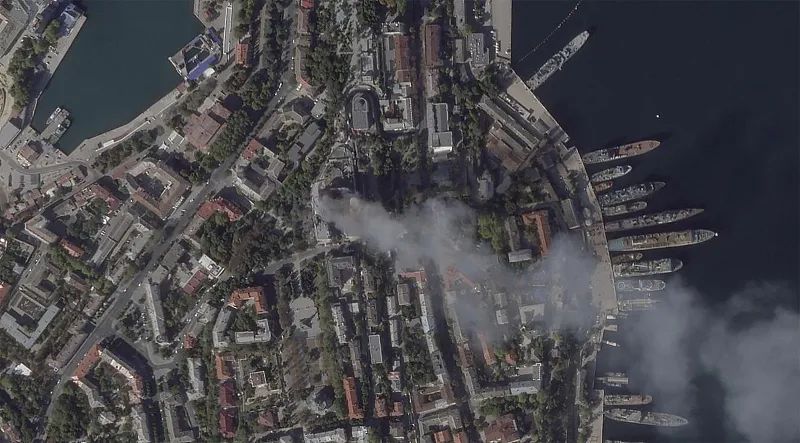 俄黑海舰队总部遭袭卫星图像。图源:视觉中国