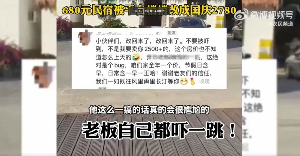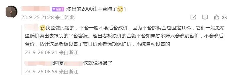 也有网友表示自己就是做民宿生意的,该网友称,平台一般不会后台改价,因为平台的佣金是固定10%,它们一般更希望低价卖出去抢别的平台客源。超出老板原价的金额平台如果想多赚只会改前台价,不会改后台价,估计这是老板设置了节日价或者远期保护价,系统自动设置的。
