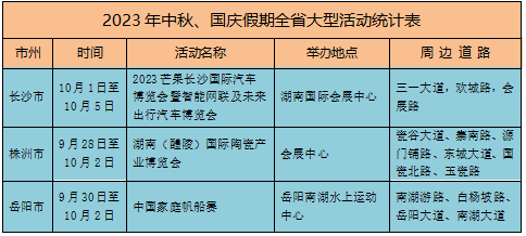 假期,省内景区将备受游客青睐,城市商圈、广场、公园等地群众休闲逛街增多。特别是全省11个5A级景区、152个4A级景区、10个特色古镇、50个民俗景点、50个夜间消费聚集区,以及长沙16个网红打卡点,长沙市的国金中心、黄兴铜像广场等97处重点商圈公园,因人流车流集中,易出现短时交通缓行。根据初步统计,假期全省共有大型活动3场,期间活动周边道路因人流车流集中易发生交通缓行。