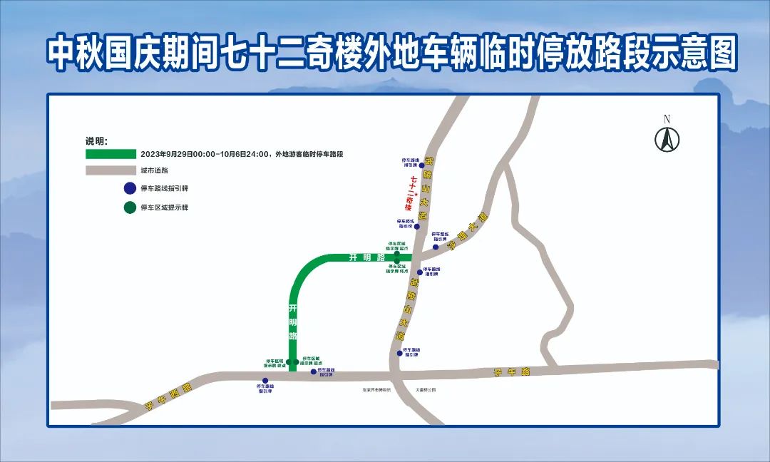 七十二奇楼外地车辆停放路段:开明路两侧道路靠右侧停放。