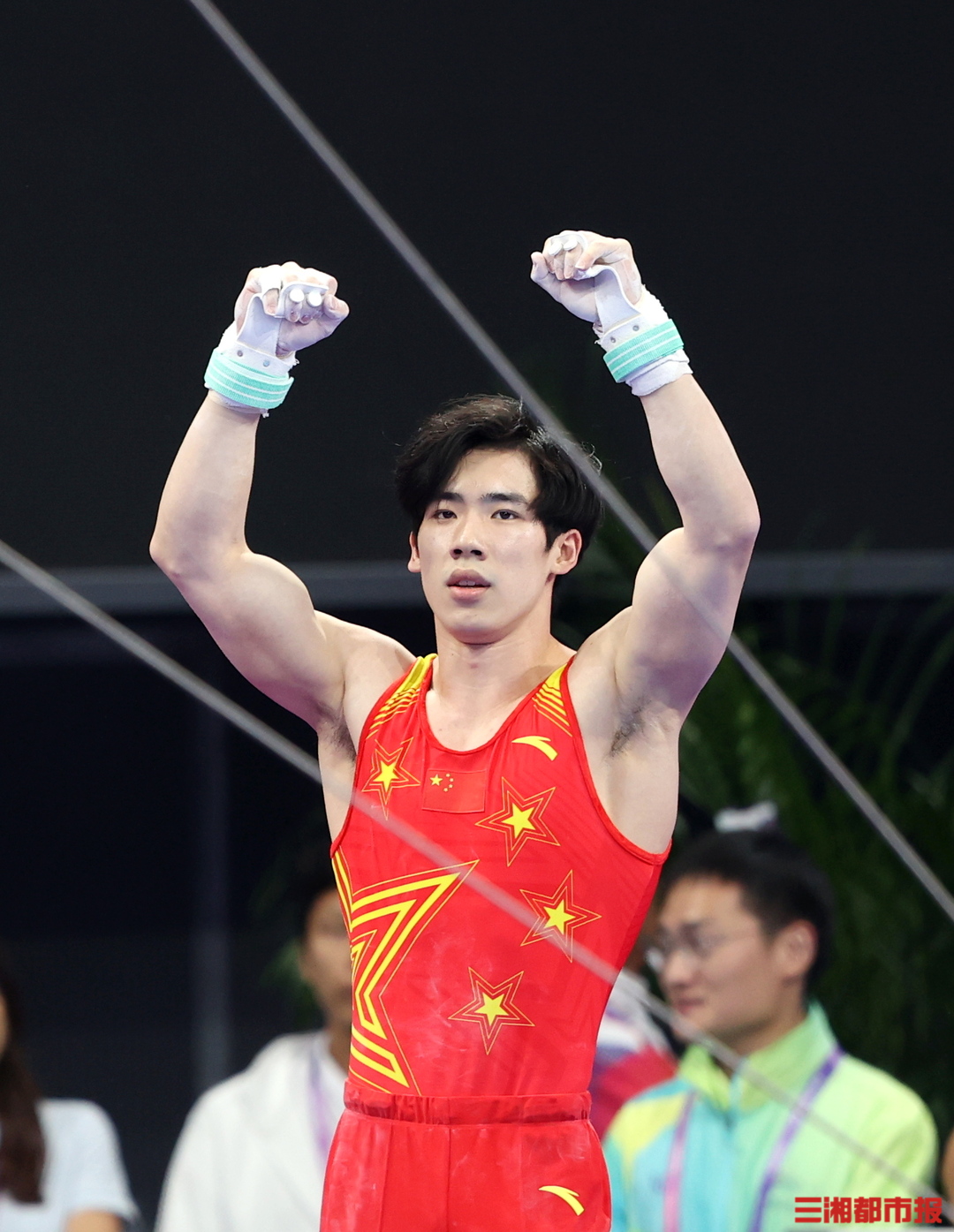 三湘都市报·新湖南客户端9月29日(全媒体记者 叶竹 视频 田甜)9月29日下午,杭州亚运会体操项目在黄龙体育中心体育馆结束了所有比赛的争夺。在最后进行的男子单杠决赛中,湖南“小骄傲”、“00后”长沙伢子张博恒以难度6.4、完成8.700的一套漂亮动作,得到15.100分,继团体冠军、个人全能冠军后收获本届亚运会的个人第三金。此外他还收获自由体操银牌。