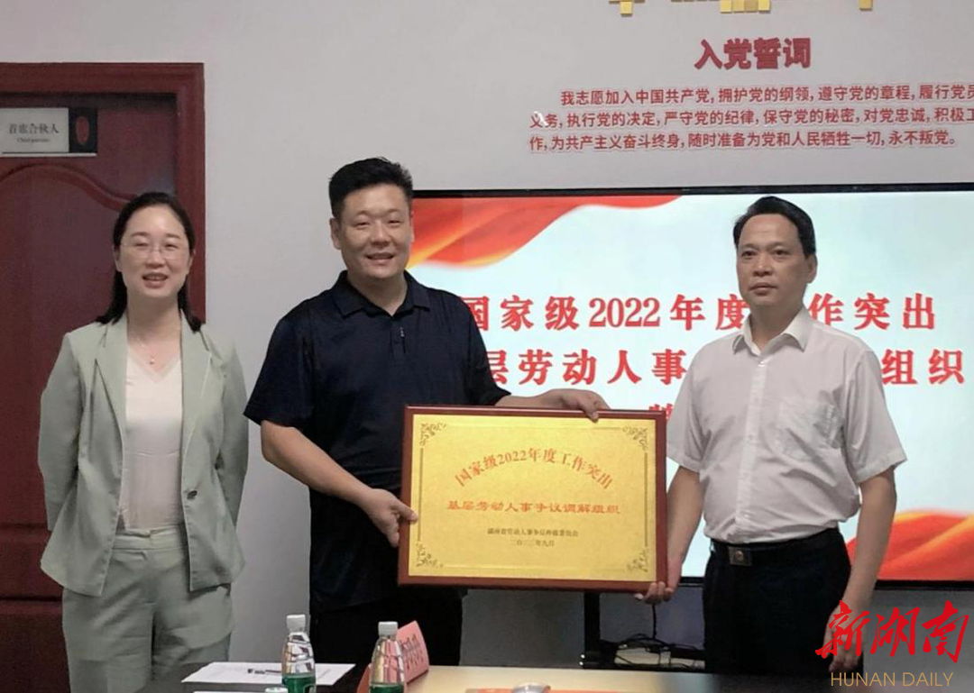 新湖南客户端9月24日讯(通讯员 王霞)9月21日下午,湖南省人力资源和社会保障厅调解仲裁处处长罗莽为长沙市天心区金盆岭街道劳动争议楼宇调解中心授予“国家级2022年度工作突出基层劳动人事争议调解组织”荣誉称号。