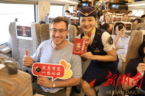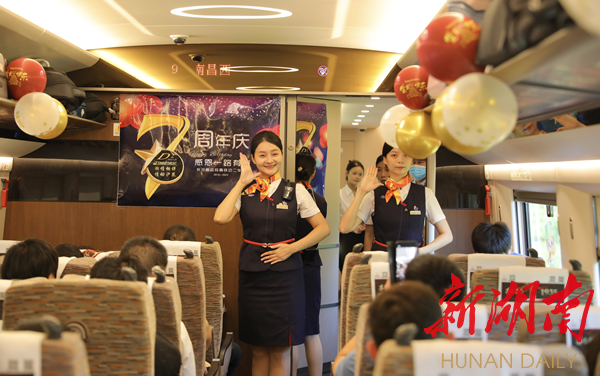 华声在线·新湖南客户端9月19日讯(通讯员 金阳 记者 卢小伟)9月19日上午,在由长沙南开往上海虹桥的G1348次列车上,一场“感恩一路有您”主题活动倾情上演。据悉,此次活动由长沙客运段动二车队为庆祝建队七周年精心策划,同时也是迎接即将到来的杭州亚运会、对列车服务改进升级后的首次上线,是车队开展“乘高铁看亚运”活动的开篇。