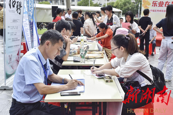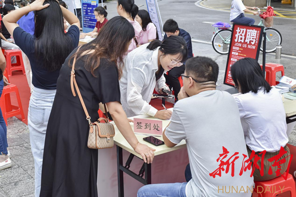 新湖南客户端9月19日讯 (通讯员 谭伟 刘银) “您好,我的专业是酒店管理,有没有这方面的工作。”近日,在长沙市开福区秀峰街道宿龙桥社区秋季招聘会现场,求职的应届毕业生陈同学正在服务台咨询。
