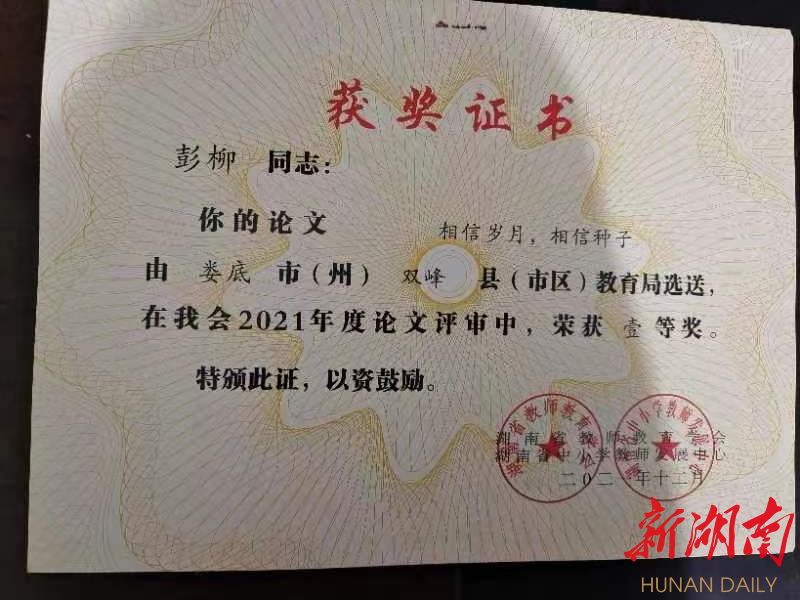 彭柳先后还带过实习老师、特岗教师,承担辅导青年教师的工作,给她们上示范课,听她们上课,看她们的教案,共同备课,研究分析教材、钻研教法,选择科学的手段和方法进行教学,互相交流经验,起到了传、帮、带的作用。年轻教师肖溪、唐婷婷、彭朗等在彭老师的指导下,在各级各类教学活动比赛中获得优秀成绩。2022年11月,她指导唐婷婷老师在2022年双峰县小学英语教学竞赛活动中,荣获一等奖。2023年3月,她指导彭朗老师在双峰县2022年度“基础教育精品课”遴选活动中荣获一等奖。她写的论文《相信岁月,相信种子》,在湖南省教师教育学会2021年度论文评审中,荣获一等奖。在2017年,在湖南省中小学教师信息技术与学科融合在线集体备课大赛中,彭柳作为主备人和执教人带领语文备课组团队,荣获一等奖。