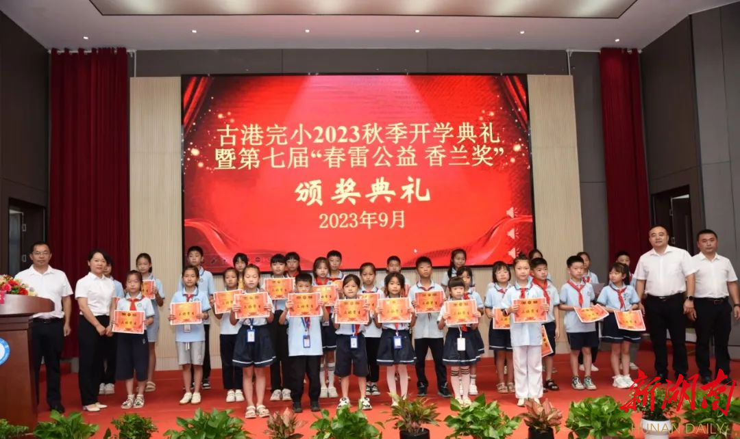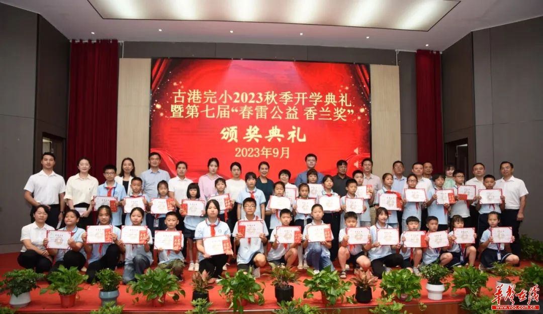 新湖南客户端9月12日讯(通讯员 周婵)秋日的骄阳,绽放着快乐的笑脸,秋天的丹桂,弥漫着欣喜的芬芳。9月7日9时18分,浏阳市古港完小第七届春雷公益·香兰奖颁奖仪式暨2023年秋季开学典礼在学校多功能报告厅拉开了帷幕。长沙市侨联、长沙春雷公益基金、古港镇人民政府、浏阳三中督学责任区、古港教育发展中心等领导一行及学校家委会主任、部分家长代表参加了本次活动。活动由学校青年教师肖璇璇、余林主持。