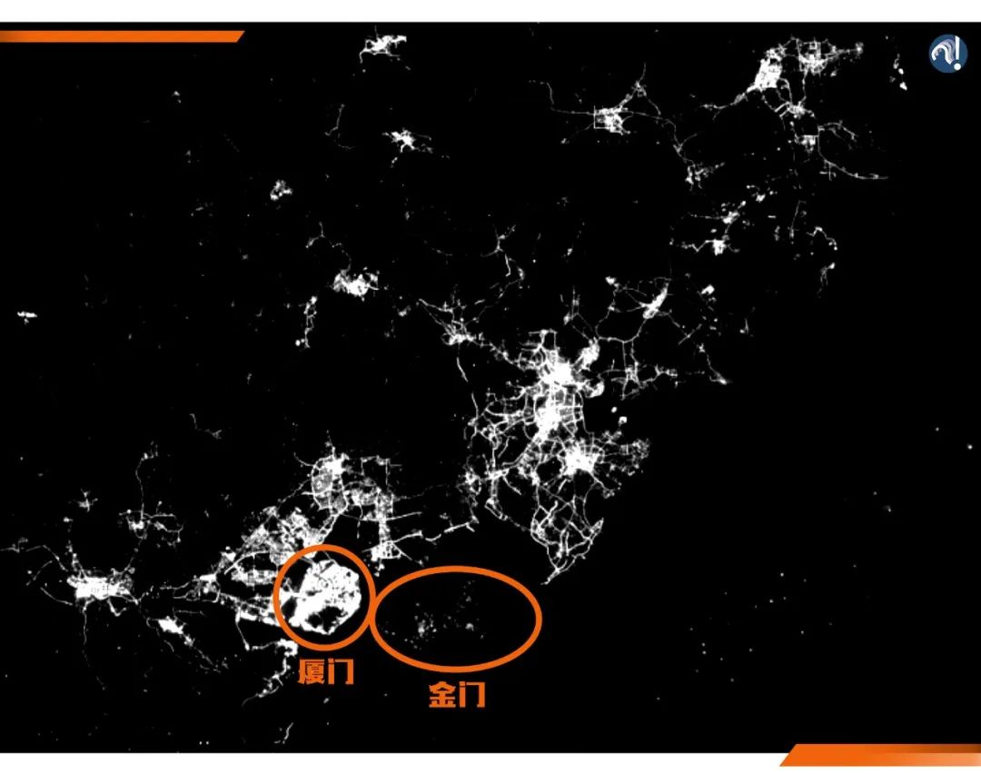 这是福建周边的夜光遥感地图。可以看到,就在厦门被点亮的时候,金门却是一片漆黑。与此同时,金门的发展也有个特点,那就是靠近大陆的地方更亮。