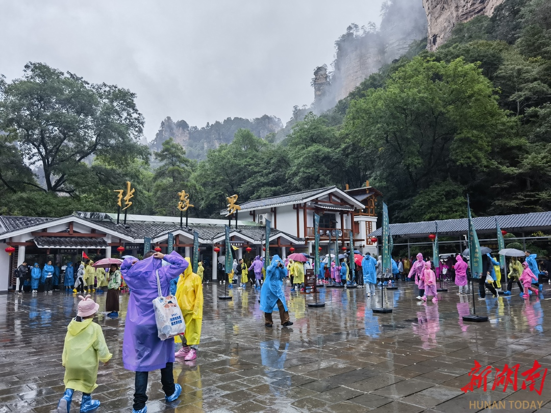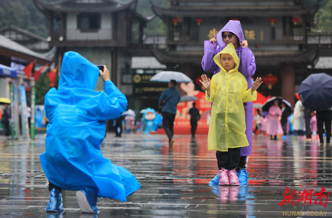 上午9时许,张家界国家森林公园南门入口,穿着各色雨衣的游客,排起了蜿蜒长队,俨然一道流动的风景线。