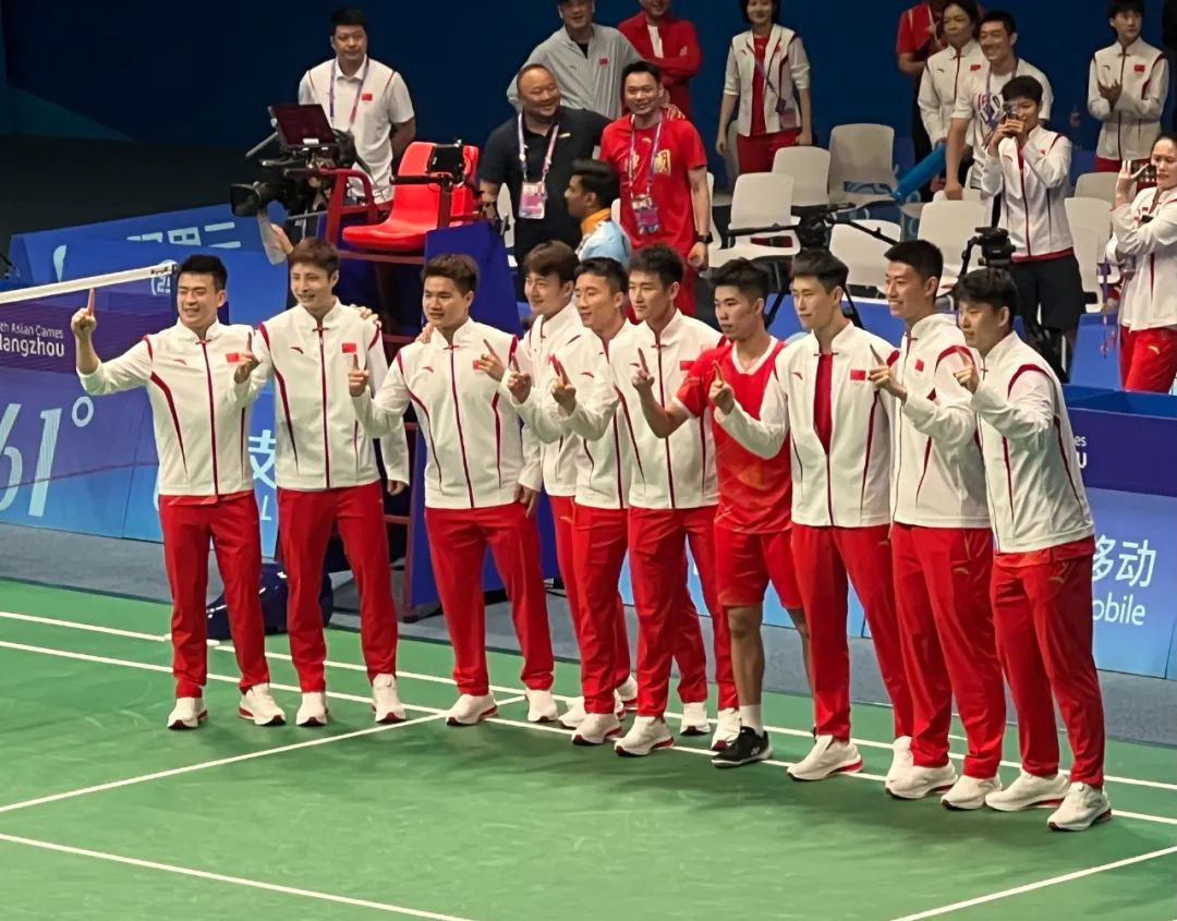 10月1日晚,杭州亚运会羽毛球男子团体决赛在滨江体育馆结束争夺,中国队逆转战胜印度队,夺得金牌。