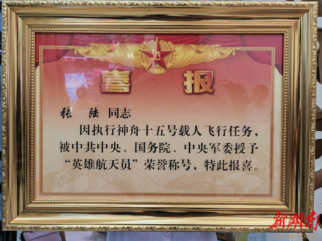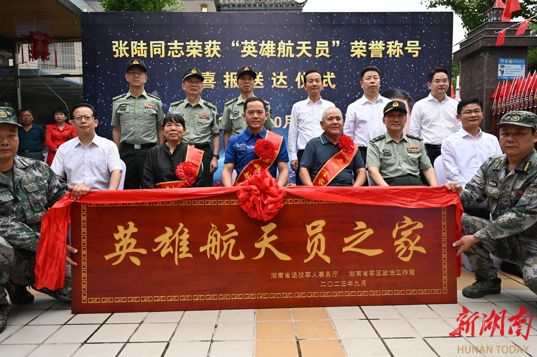 湖南日报·新湖南客户端10月2日讯(记者 姜鸿丽 鲁融冰 刘蓉 通讯员 徐虹雨 程震寰)10月1日,在汉寿县张陆家中,张陆同志荣获“英雄航天员”荣誉称号喜报送达仪式隆重举行,省军区少将副司令员张江华宣读表彰决定,并为张陆敬送喜报,为其父母敬送“英雄航天员之家”匾额。