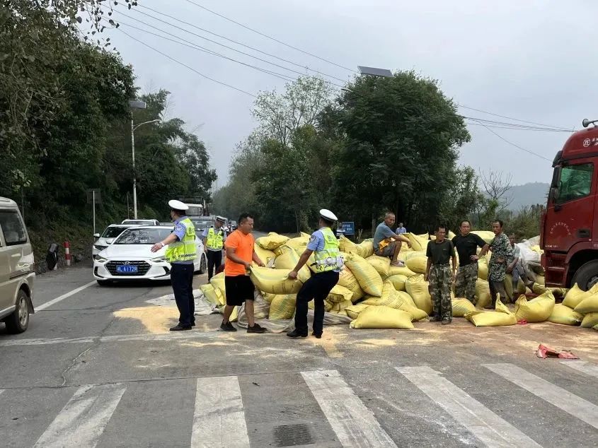 10月2日上午,在国道107线荷叶塘村村委会前路段,一辆装满货物的大挂车发生侧翻,导致国道车辆无法通行,幸而未造成人员受伤,交警三大队栖凤渡中队值班人员立即赶到现场。在疏导交通的同时,帮助驾驶员把散落在道路上的货物搬移至安全地段,以最快速度恢复交通单向通行。切实保护人民群众生命财产安全,维护道路安稳畅通。