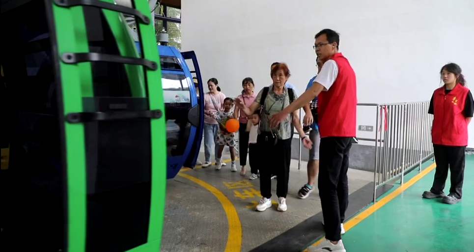 在苏仙岭景区大门口,络绎不绝的游客有序地刷脸进入景区,而在索道乘坐处,身穿红马甲的志愿者正耐心地组织着游客乘坐缆车。