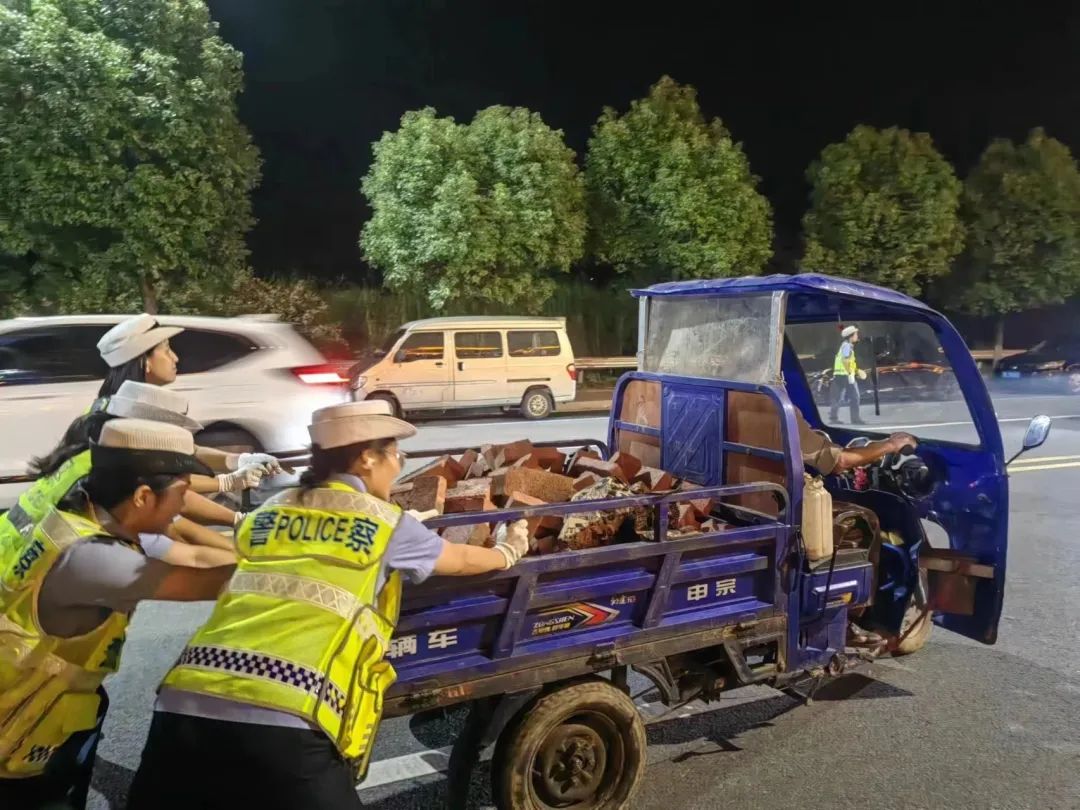 10月2日晚上,交警支队政工科、交管科支援交警在景区郴州长卷文化旅游度假区执勤时,遇故障三轮车停滞路中无法前行。女交警见状立刻招呼身边同事合力将故障三轮车移至道路边安全区域,保障三轮车驾驶员人身安全的同时维护景区道路安全畅通。