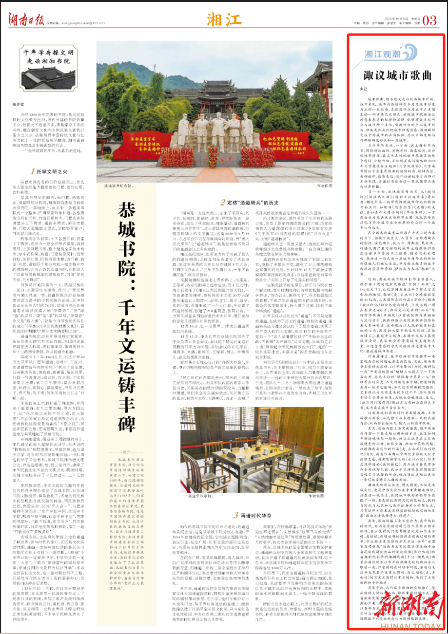湖湘文化源远流长、博大精深,不仅是地域文化,更是中华文化体系中重要组成部分,站在这一视角上,我们城市歌曲的创作不能限于一隅,要在依托湖湘文化的基础上,找到与时代与人民和人类命运共同体的契合点,只有这样才能真正实现创造性转化创新性发展,歌曲也才能传得久、传得广。