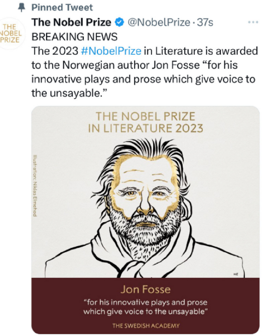 挪威作家约翰·福瑟(Jon Fosse)获得2023年诺贝尔文学奖。