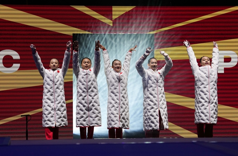 中国队选手邱祺缘、张清颖、周雅琴、欧钰珊、黄卓凡(从左到右)在女子团体决赛比赛前出场。新华社记者 郑焕松 摄