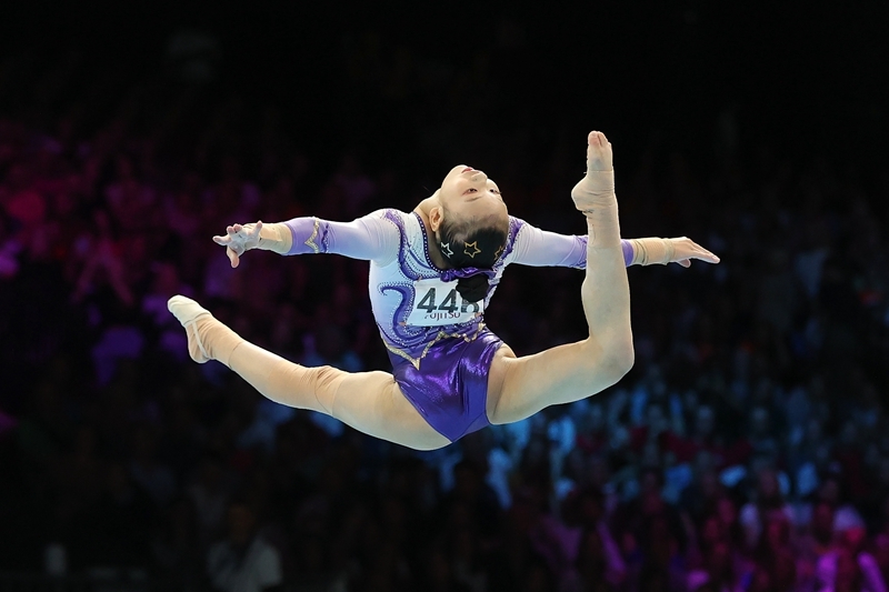 中国选手邱祺缘在女子个人全能决赛自由操项目比赛中。她最终获得第四名。新华社记者 赵丁喆 摄