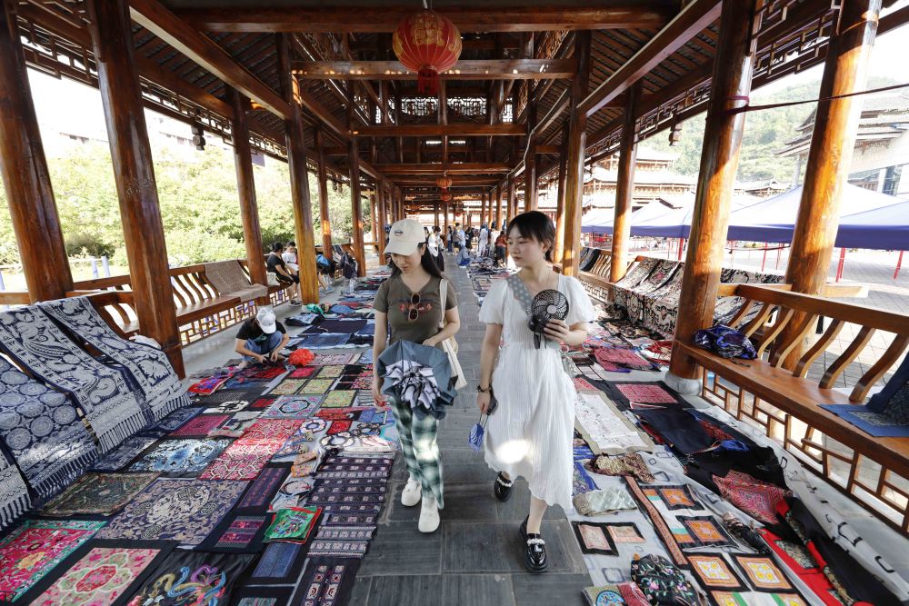 10月4日,游客在贵州省黔东南苗族侗族自治州凯里市民族风情园非遗集市参观。新华社发(杨晓海 摄)
