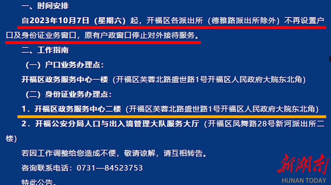 需要注意的是,10月7日起, 长沙市公安局开福分局除人口与出入境管理大队服务大厅与德雅路派出所外,各派出所户口及身份证业务窗口均搬迁至开福区政务服务中心。