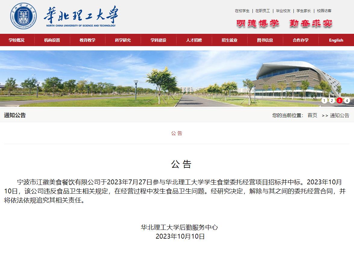 当天,华北理工大学后勤服务中心发出公告称,宁波市江徽美食餐饮有限公司于2023年7月27日参与华北理工大学学生食堂委托经营项目招标并中标。2023年10月10日,该公司违反食品卫生相关规定,在经营过程中发生食品卫生问题。经研究决定,解除与其之间的委托经营合同,并将依法依规追究其相关责任。