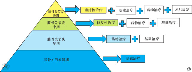 该院骨科专家介绍,为了规范膝关节炎的临床诊疗,中华医学会骨科分会关节外科学组制定的《骨关节炎诊疗指南(2018 年版)》中提出了膝骨关节炎阶梯治疗策略(见下图),该治疗策略旨在根据患者的病情情况不同,选择不同的治疗方案。