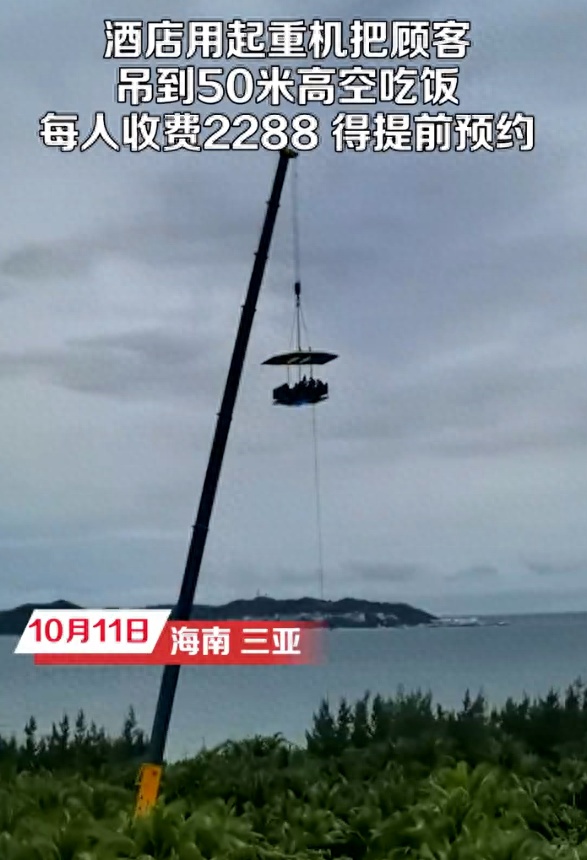 10月12日,据大象新闻援引沸点视频报道,近日海南三亚一家酒店推出空中餐厅,用起重机将顾客吊到50米高空用餐,此事引发关注。