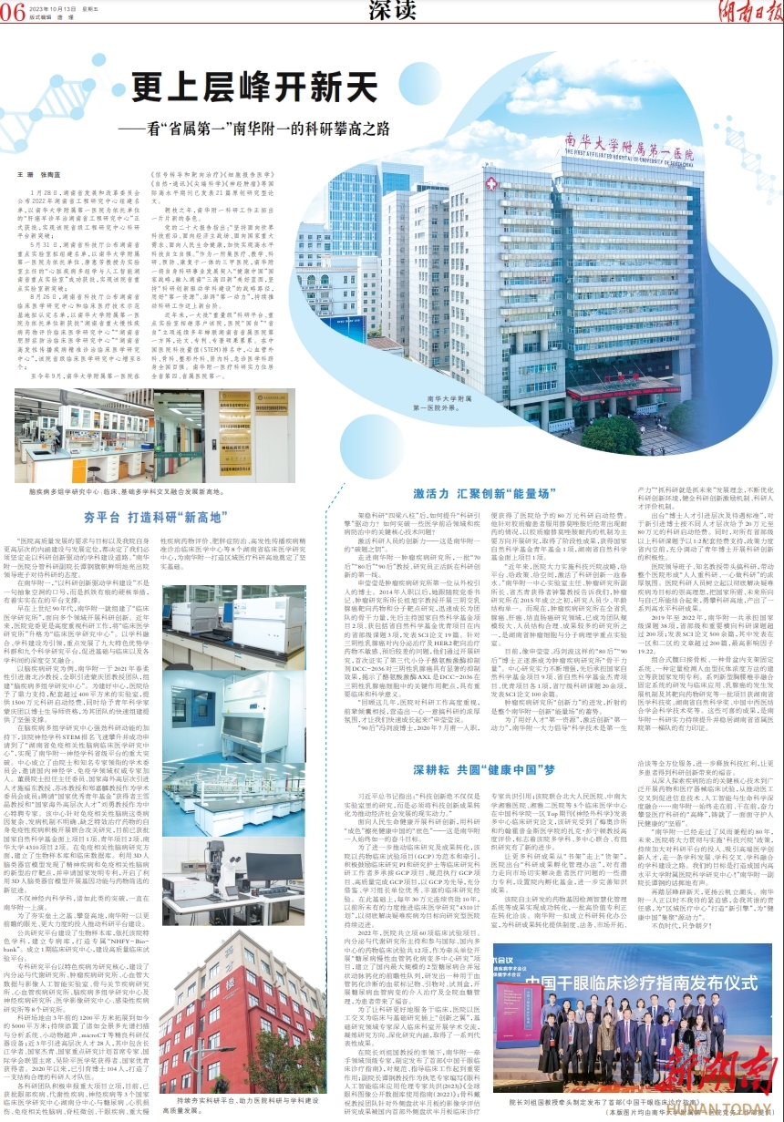 在院长刘祖国教授的率领下,南华附一牵手领域顶级专家,制定发布了首部《中国干眼临床诊疗指南》,对规范、指导临床工作起到重要作用;副院长谭钢教授作为执笔专家编写《眼科人工智能临床应用伦理专家共识(2023)》《全球眼科图像公开数据库使用指南(2022)》;骨科戴祝教授团队针对外侧盘状半月板的影像学评估研究成果被国内首部外侧盘状半月板临床诊疗专家共识引用;该院联合北大人民医院、中南大学湘雅医院、湘雅二医院等5个临床医学中心在中国科学院一区Top期刊《神经外科学》发表多中心临床研究论文,该研究受到了梅奥诊所和约翰霍普金斯医学院的扎克·彭宁顿教授高度评价,标志着该院多学科、多中心联合、有组织研究有了新的进步。