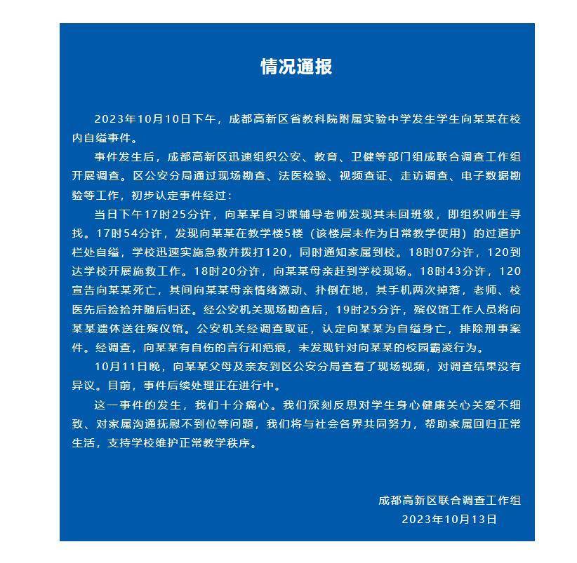 成都高新区发布关于“中学生校内自缢事件”的情况通报