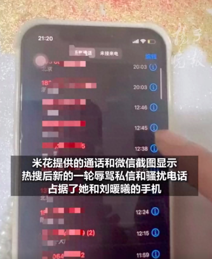 米花提供的通话和微信截图显示,登上热搜后,新的一轮辱骂私信和骚扰电话占据了她和刘暖曦的手机。