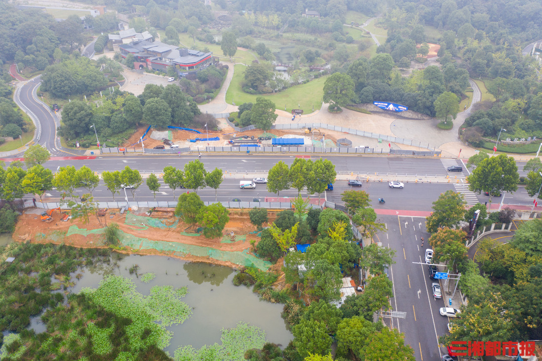 梅溪湖路桃花岭公园入口过街工程项目占地面积约 825 平方米,位于梅溪湖国际新城一期,梅溪湖路桃花岭景区入口处,拟建设地下过街通道。主要建设内容为新建地下通道,包括土方、结构、基坑支护、排水、照明、装修、路面恢复及杆线迁改等。主通道长40米,总宽度约4.9米,通道横断面:主通道结构面总宽度4.9米,总高度3.65米。经了解,项目已完成管线改迁,正在进行主体施工。