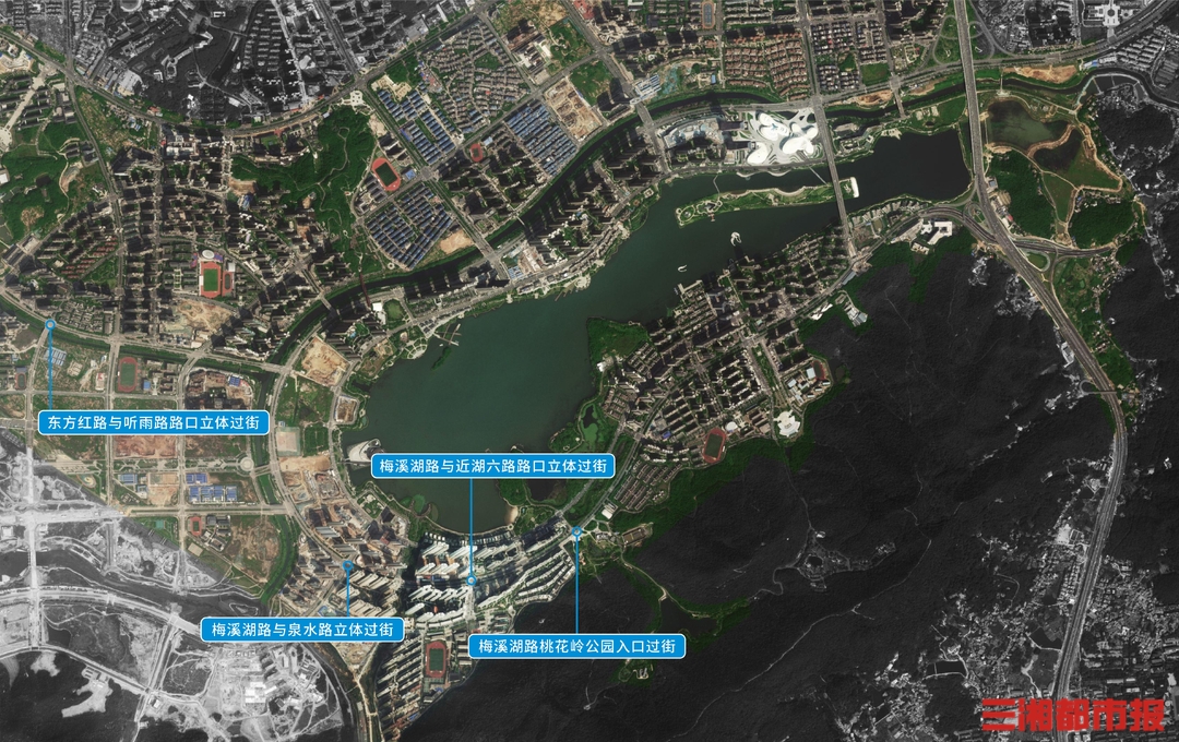 (梅溪湖路桃花岭景区入口过街航拍图)