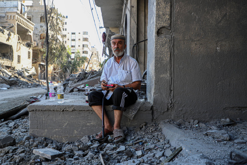 ↑10月12日,在加沙城,一名男子坐在被以色列空袭炸毁的建筑旁。新华社发(里泽克·阿卜杜勒贾瓦德摄)